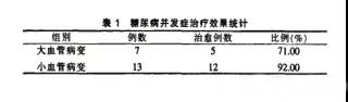 2.2糖尿病并发症治疗效果统计高压臭氧大自血疗法治疗后大血管病变7例中5例治愈,小血管病变13例中12例治愈。结果见下表。